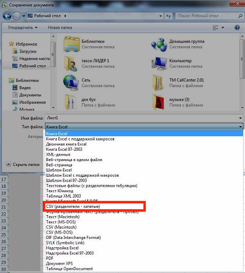 После этого у Вас откроется новое окно, где Вам нужно будет выбрать название файла и его расположение. Для удобства выберите "Рабочий стол", введите желаемое имя и нажмите на список "Тип файла". В раскрывшемся списке Вам нужно выбрать пункт "CSV (Разделители - запятые)".